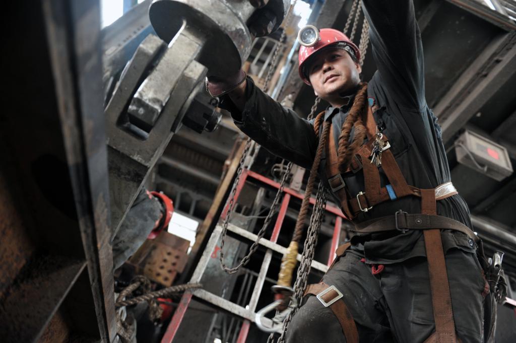 上图为祁南矿职工对“尾绳旋转器”进行安装。