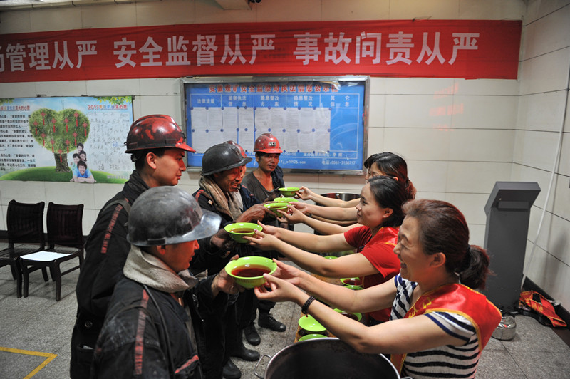 7月12日,是农历入伏第一天,淮北气温高达35°,许多人都躲进阴凉地和空调屋里避暑了,而朔石公司女工委却组织女工协安员们抬着一桶桶精心熬制的绿豆汤,拿着白糖、碗勺,中午冒着高温奔向东部井井口,慰问上下班的职工,同时不忘对他们进行亲情安全叮嘱。