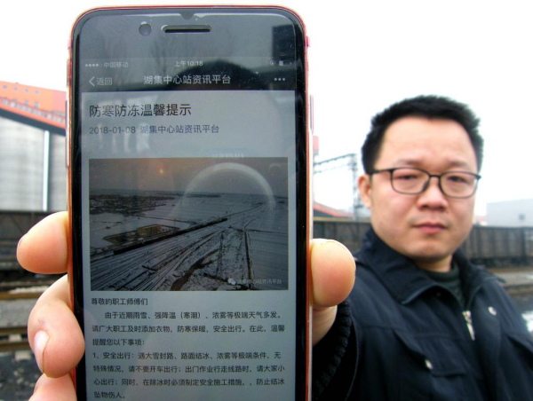 “由于近期雨雪、寒潮、浓雾等极端天气多发,请广大职工及时添加衣物,防寒保暖,安全出行……”为超前应对、切实加强防寒防冻工作,铁运处借助微信公众平台传播快、信息量大、关注度高的优势,及时向全处职工发布冬季防寒防冻的温馨提示,切实加强冬季安全教育管理,确保职工人身安全万无一失。图为湖集中心站职工展示防寒防冻提醒信息。(责编 孟慧奇)
