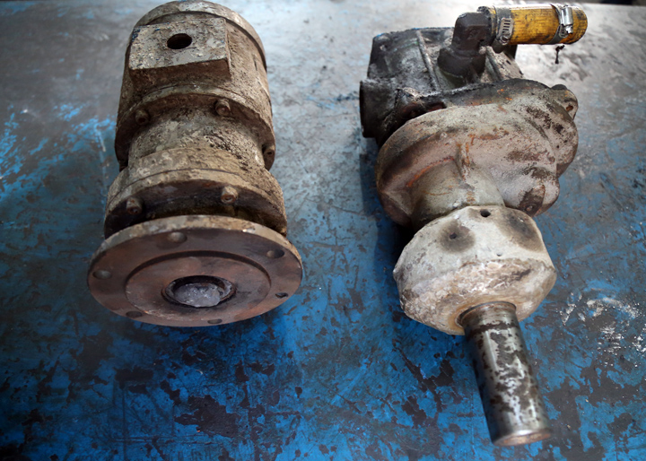 图为损坏搅拌机马达(左)与废旧的锚杆机气动马达(右)