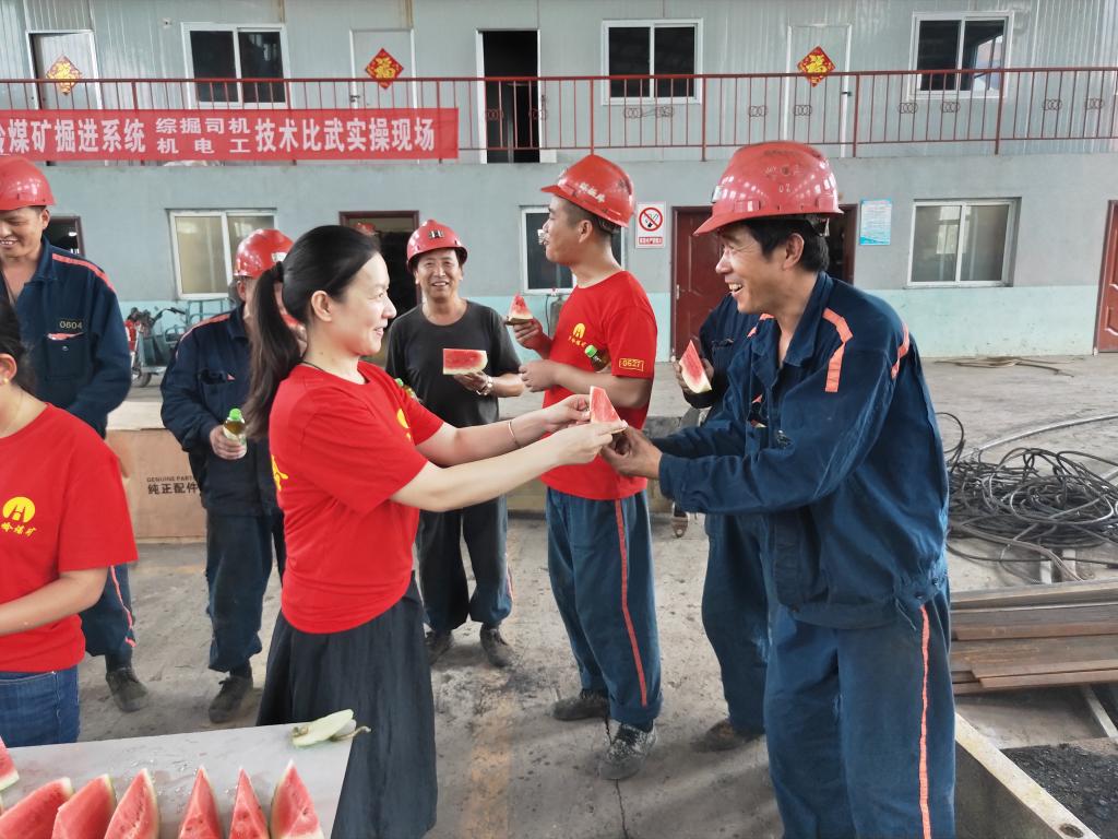 “师傅,给,吃块瓜解解渴吧,下井注意安全。”活动中,协安员一边为职工送上沙瓤甘甜的西瓜和绿茶,一边叮嘱职工高温季节注意防暑降温,确保身体健康和矿井安全生产。
