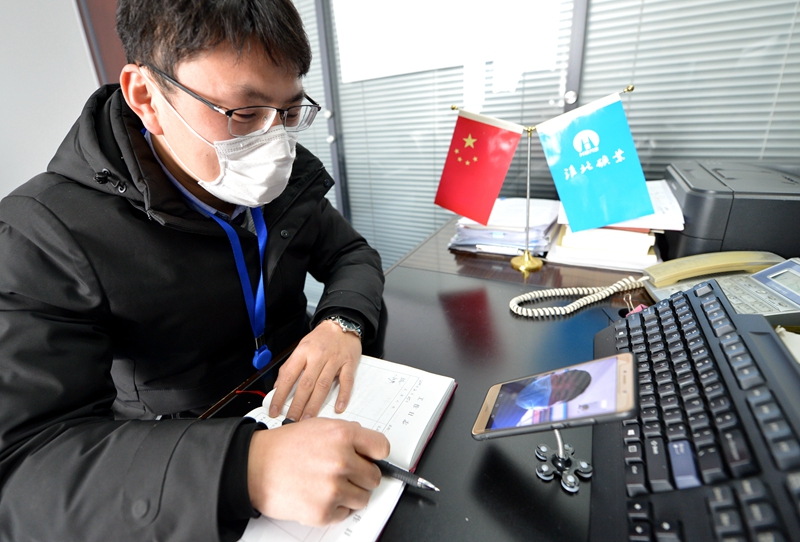 组织(人事)部负责高校毕业生招聘的人员通过视频方式对应聘者进行面试。陈磊 摄