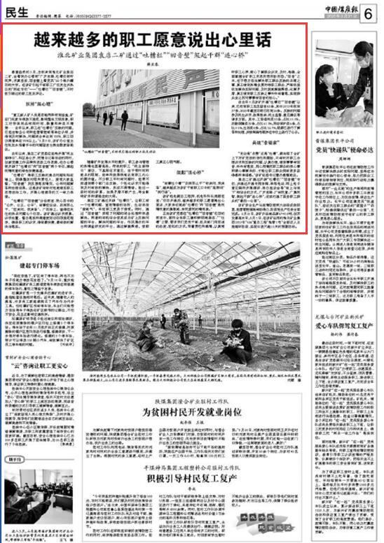 该矿机电副总工程师、机电科科长周顺坦言:“栏目开通后,越来越多的职工愿意掏出心里话,大家亲切地称‘吐槽栏’和‘回音壁’是民情民意的集散地、亲民爱民的晴雨表。”
