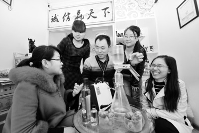4月8日,淮北市民生路旁的一家店铺里,王芳(中)向团队成员讲解核桃油品质的鉴别技巧。《安徽日报》(4月19日6版)