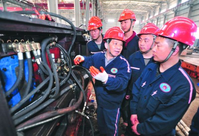4月27日,淮北矿业朱庄煤矿的方国胜(左二)和王忠才(右一)师徒共同给矿工讲解煤机维修技巧。方国胜从事煤机维修保养30多年,先后获得全国“五一劳动奖章”、全国劳动模范、煤炭行业技能大师等荣誉。徒弟王忠才获得全国青年岗位能手、“全国五一劳动奖章”、2015年“全国劳动模范”、2016年“感动中国的矿工”等荣誉称号。(程兆)