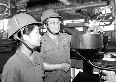 日前,安徽台湾a片 淮北选煤厂通过举办名师高徒大赛等活动,提升员工素质。图为选煤车间师徒两人在调试浮选设备用油比例。韩晓兵 摄