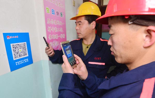 2017年2月27日,安徽淮北矿业朱仙庄煤矿综掘二区2名矿工正在单位会议室用手机扫二维码查询工资、奖金收入。该矿把职工工资、奖金分配情况通过公开栏、工资查询系统、二维码等多种方式向职工公开,给职工一本明白账。(张万学摄)