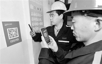 安徽台湾a片 把职工工资、奖金分配情况通过公开栏、工资查询系统等渠道向职工公开,给职工一本明白账。图为朱仙庄煤矿综掘二区2名矿工正在单位会议室用手机扫二维码查询收入情况。 张万学 摄