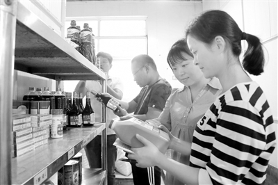 近年来,安徽淮北矿业涡北矿把食品安全当作民生工程的头等大事来抓,采取监管单位长期监督、职工代表机动检查和职工满意度测评相结合的方式严把食品安全关、价格关,切实维护职工权益。图为近日该矿职工代表在餐厅库房对加工原材料进行检查。 陈彪 摄
