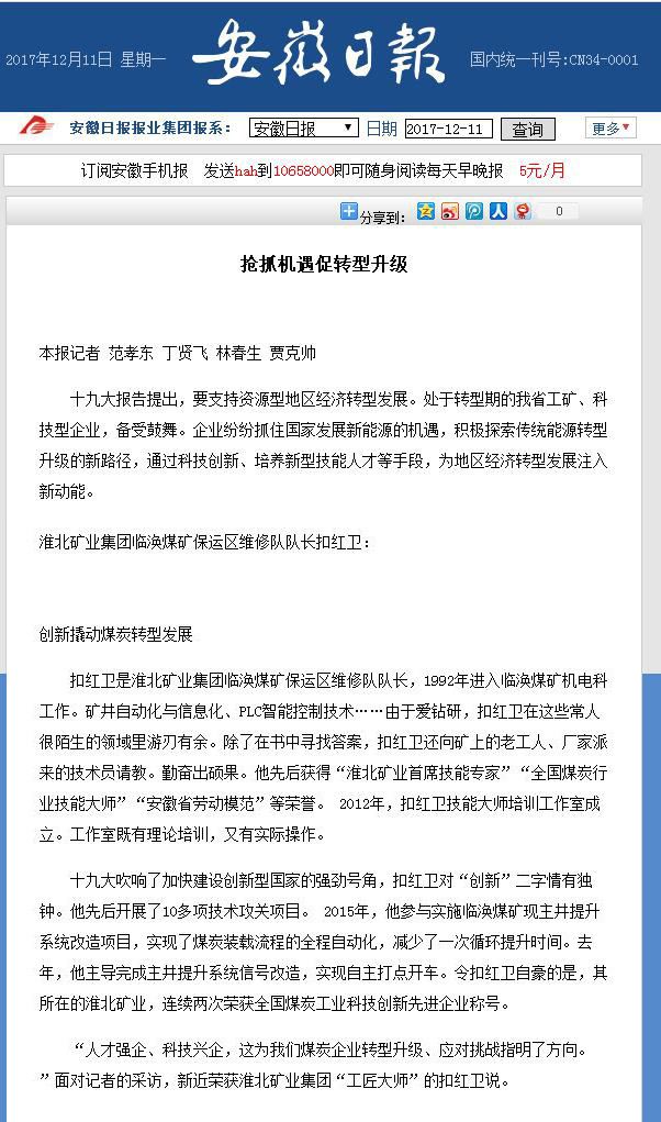 十九大吹响了加快建设创新型国家的强劲号角,扣红卫对“创新”二字情有独钟。他先后开展了10多项技术攻关项目。 2015年,他参与实施临涣煤矿现主井提升系统改造项目,实现了煤炭装载流程的全程自动化,减少了一次循环提升时间。去年,他主导完成主井提升系统信号改造,实现自主打点开车。令扣红卫自豪的是,其所在的淮北矿业,连续两次荣获全国煤炭工业科技创新先进企业称号。