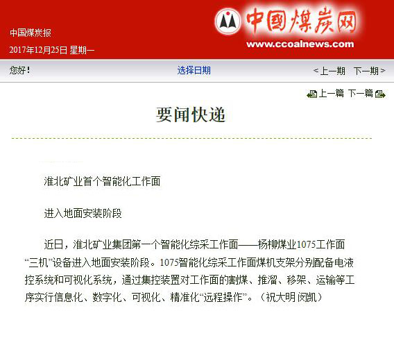 《中国煤炭报》1版:淮北矿业首个智能化工作面进入地面安装阶段