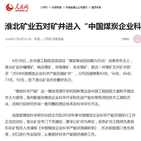 6月30日,在中国工程院咨询项目“煤炭革命的战略与方向”成果发布会上,淮北矿业孙疃煤矿、杨庄煤矿、祁南煤矿、朱庄煤矿、袁店一井煤矿五对矿井获评“2018中国煤炭企业科学产能百强矿井”,分列百强榜第42名、56名、66名、77名、92名,创下淮北矿业历史最好名次。