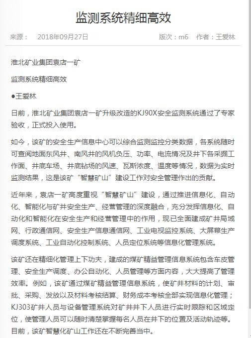 《中国煤炭报》:袁店一矿监测系统精细高效
