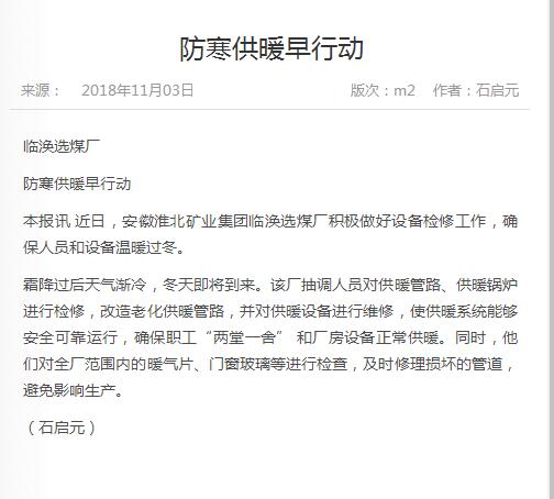 《中国煤炭报》:临涣选煤厂防寒供暖早行动
