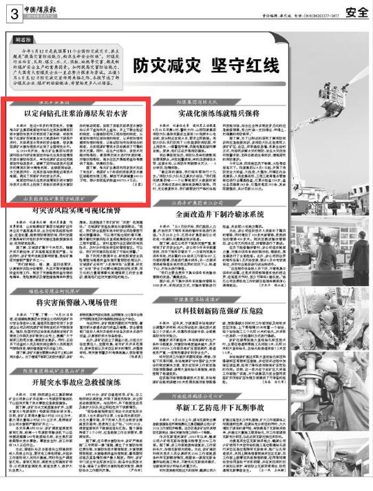 地面定向钻孔注浆改造薄层灰岩水害防治技术目前实现了新突破,有效消除了在煤矿深部复杂水文地质条件下煤层开采时,灰岩承压水带来的安全隐患,使该集团煤矿水害治理技术达到了全国领先水平。