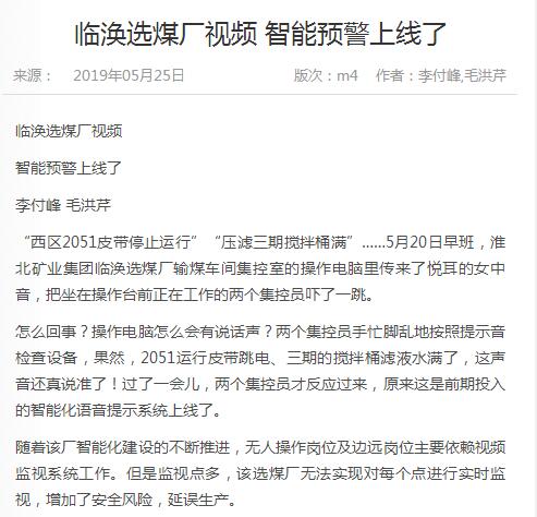 《中国煤炭报》:临涣选煤厂视频智能预警上线了